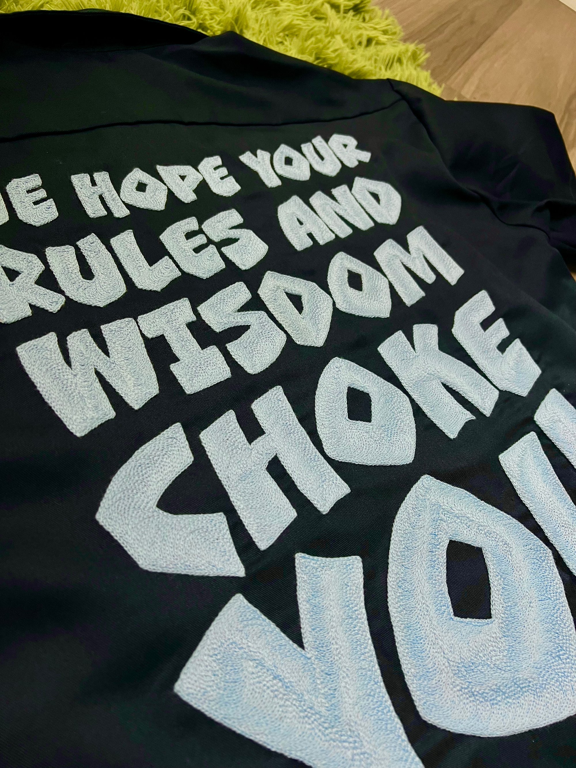 *Hand-cranked light blue colored chainstitch embroidery on a dark navy Dickies short sleeve work shirt