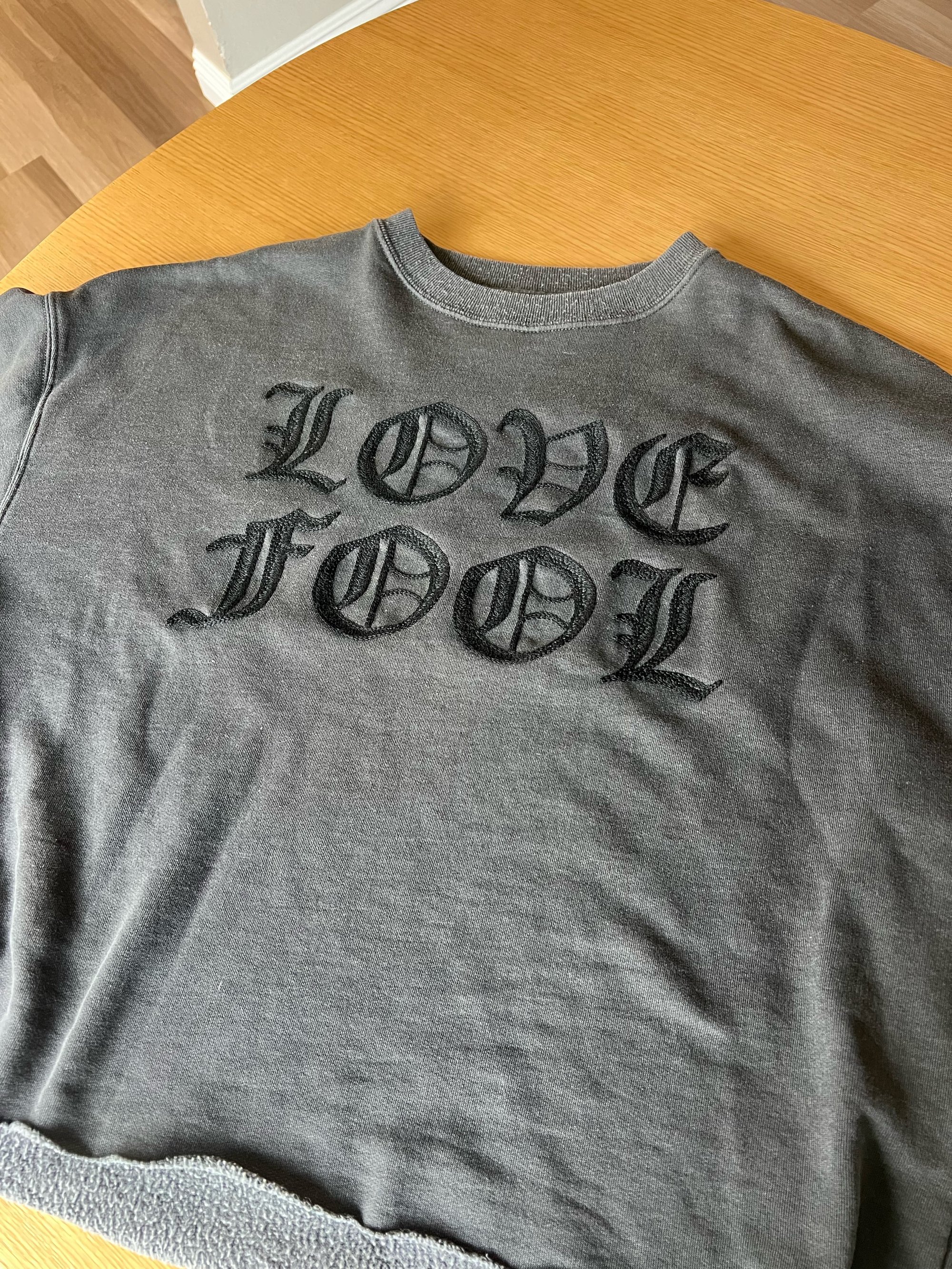 *Hand-made old english chainstitch embroidery on a thrifted grey wash pull over