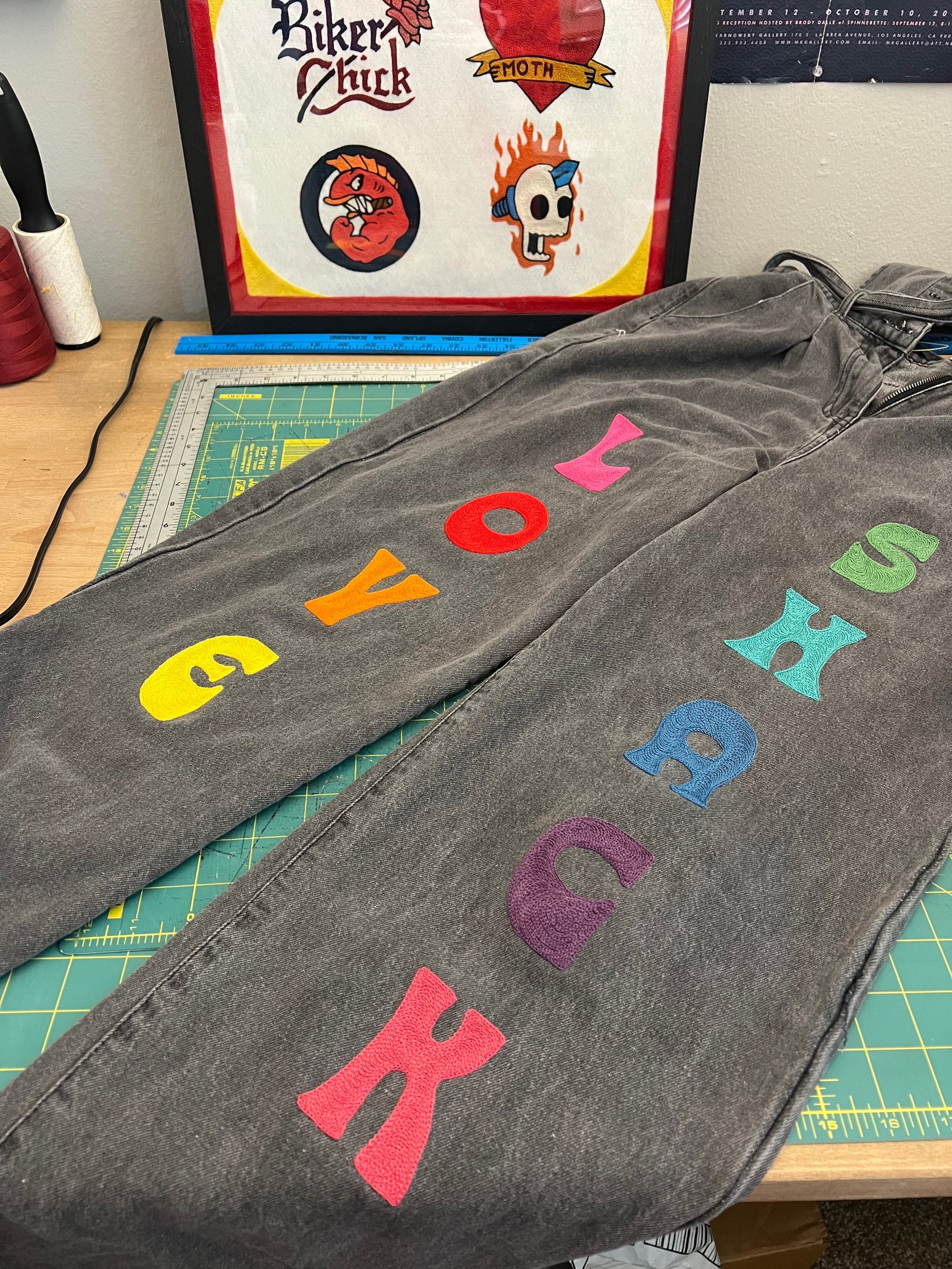 *Hand-made chainstitch embroidery on thrifted denim overalls