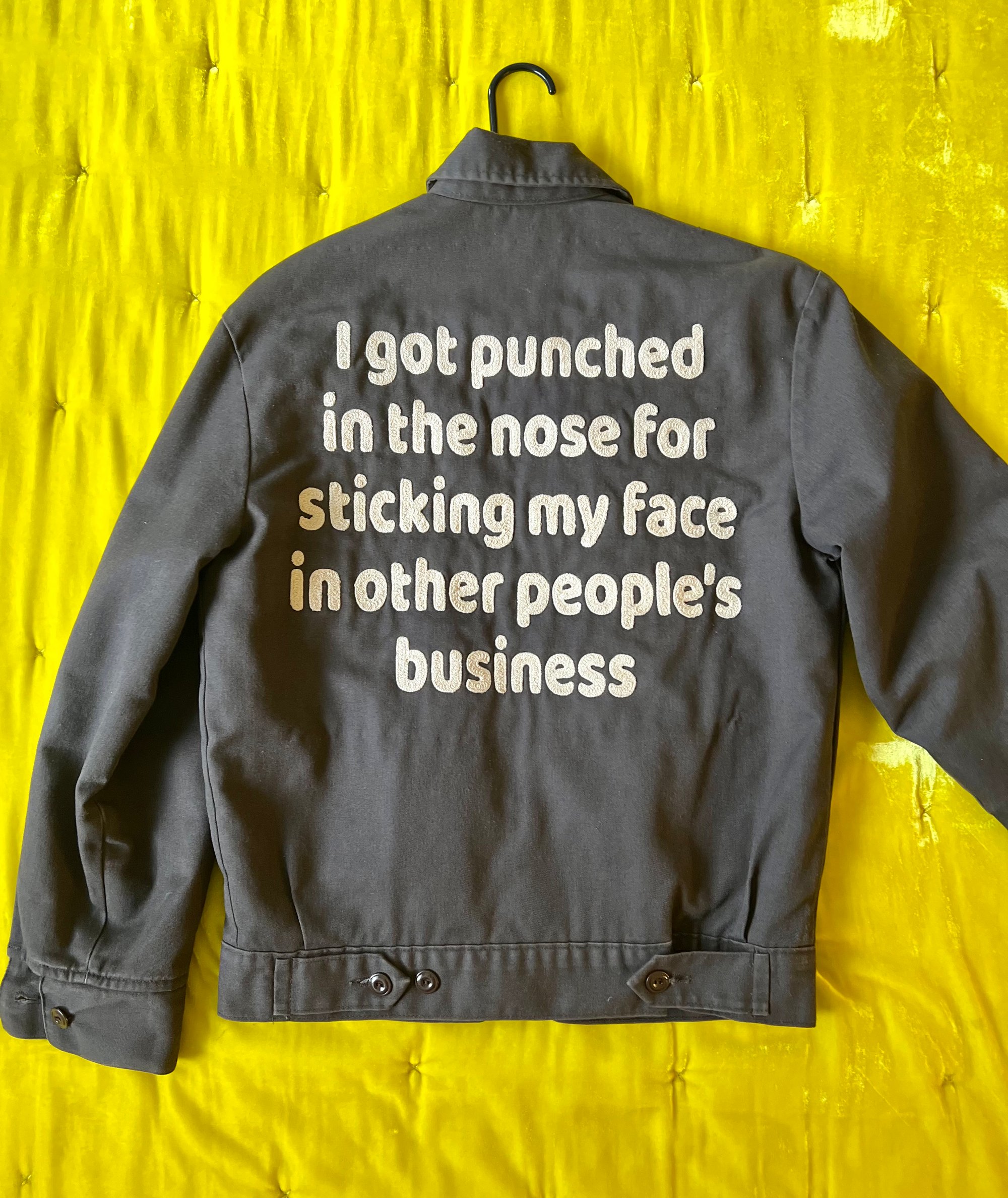*Hand-made tan colored chainstitch embroidery on a brown Dickies eisenhower insulated jacket
